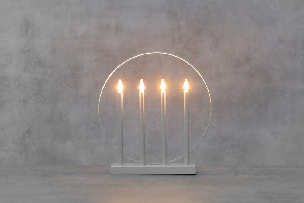Kaunis paristokäyttöinen kynttelikkö sädekehällä. 4 kpl lämmin valkoinen LED. Paristokotelo kynttelikön jalassa. 6h On/18h Off-ajastin. IP20, vain sisäkäyttöön. Paristot eivät sisälly pakkaukseen.