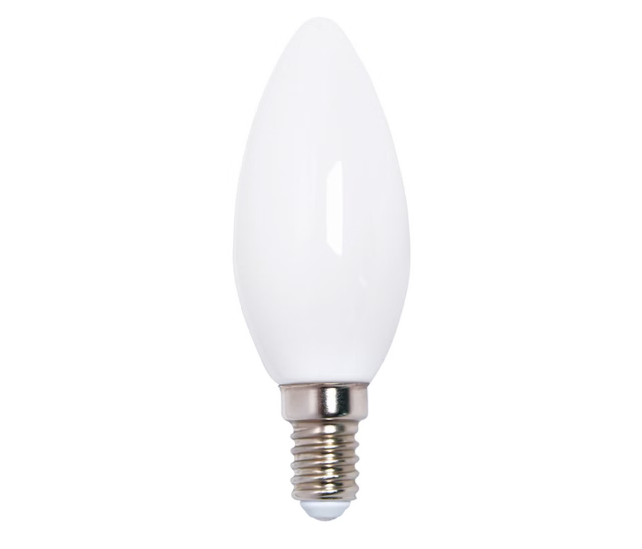 Opaali kynttiläkupuinen led-lamppu E14-kannalla. Lampun teho 4,5W. Lampun värilämpötila on 4000K ja valovirta 470lm. 2kpl/paketti.