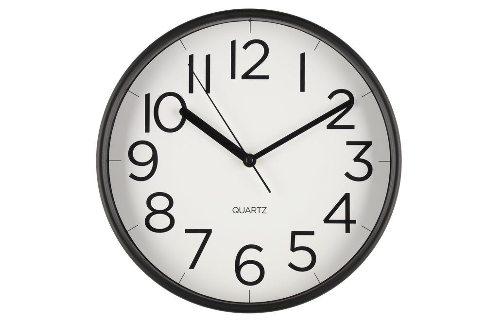 Klassinen seinäkello selkeillä numeroilla. Musta muovikehys. Valkoinen tausta mustilla numeroilla. Hiljainen koneisto.